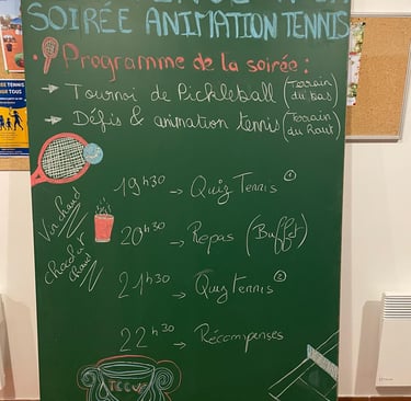 Samedi soir, une trentaine de participants ont répondu présent pour cette nouvelle animation conviviale ! 🙂 Au menu : quiz tennis, tournoi de pickleball, défis tennis… le tout suivi d’un bon repas partagé dans la bonne humeur ! Un grand merci à Jonathan et Laurent pour l’organisation de cette superbe soirée, ainsi qu’aux bénévoles pour leur aide ! 👏🏼